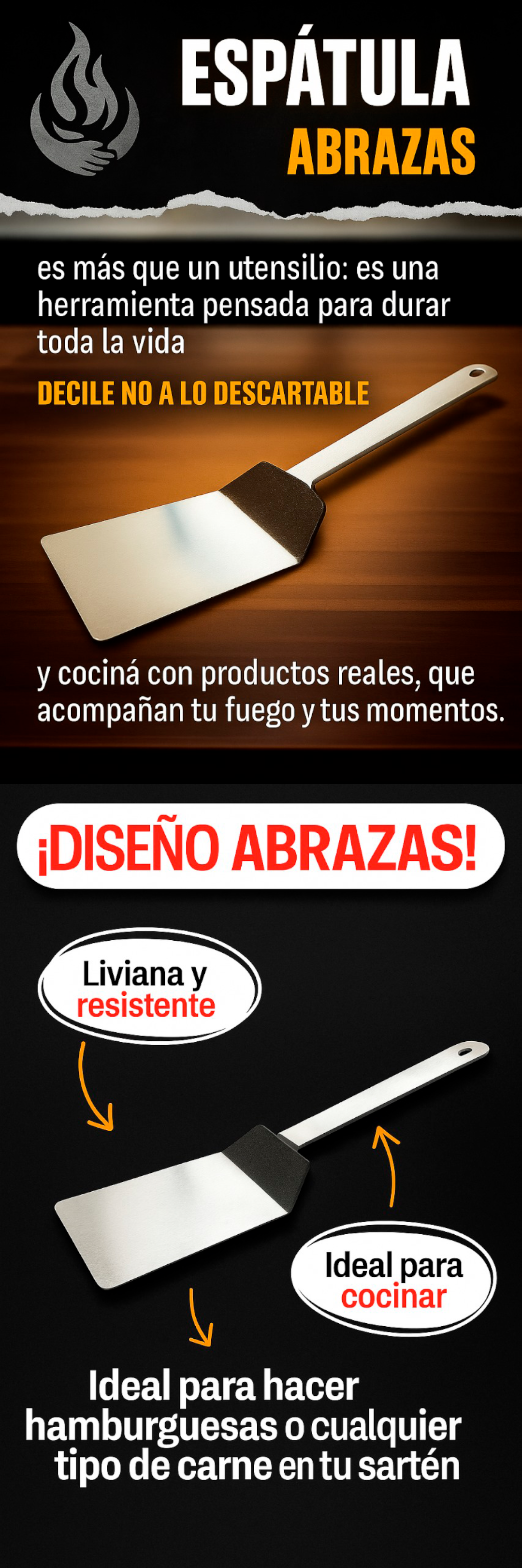 La espátula Abrazas es fuerte, resistente y está fabricada en acero inoxidable 100 %, ideal para manipular alimentos en planchetas, parrillas o sartenes de hierro sin dañarlos ni liberar tóxicos.